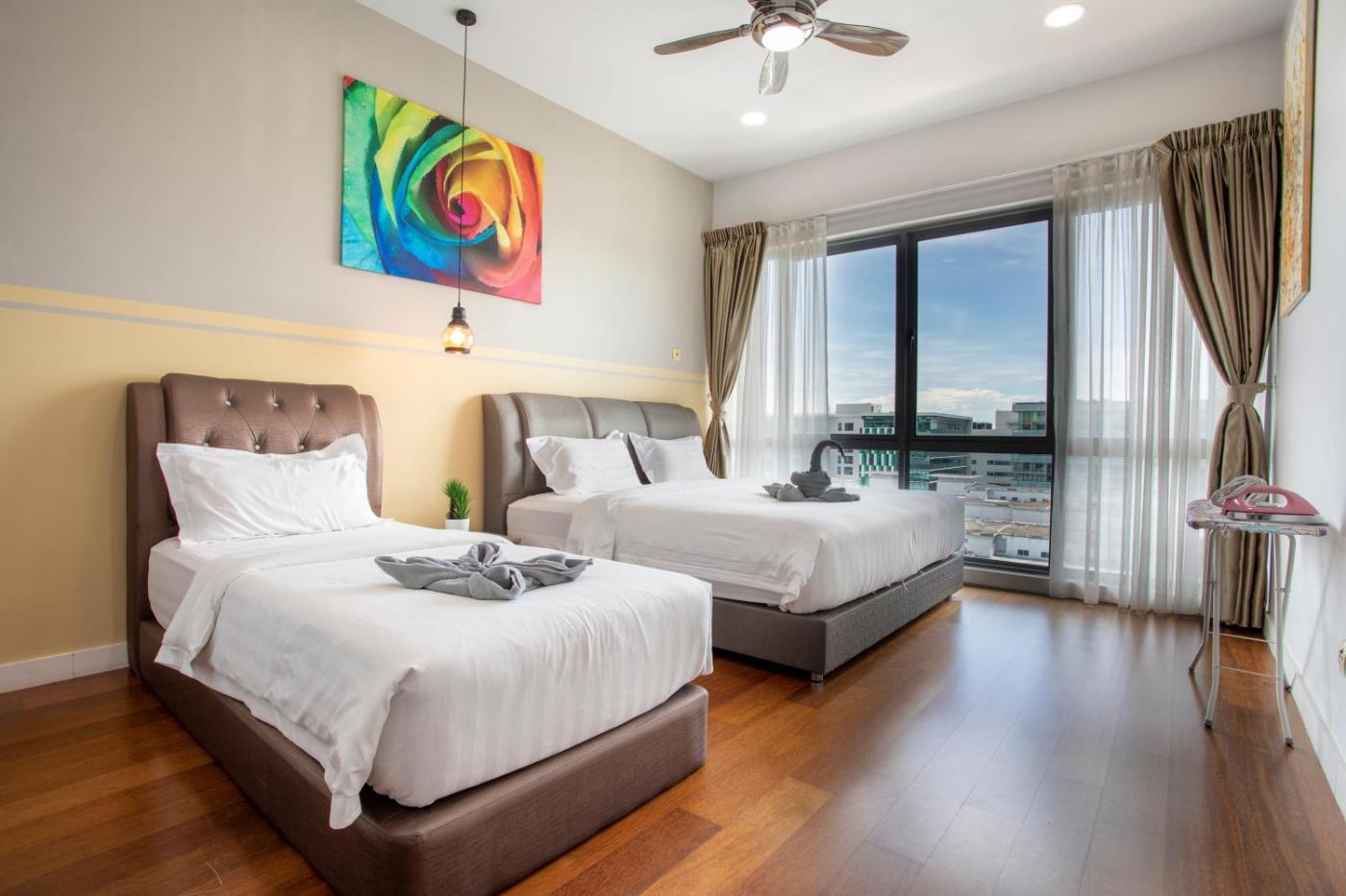 Three-Bedroom Apartment Suite. This apartment features a infinity pool. Featuring 3 bedrooms, this spacious apartment offers 2 bathrooms with a walk-in shower, a seating area and terraceyou can relax. Meals can be prepared in the well-fitted kitchen, which comes with a stovetop, a refrigerator, kitchenware and a microwave. The air-conditioned apartment provides a flat-screen TV with streaming services, a washing machine, soundproof walls, a dining area as well as garden views. The unit has 3 beds and 1 futon.